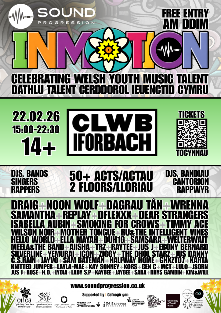 InMotion builds on Sound Progression’s ongoing work delivering free, open-access music mentoring across Cardiff in formal partnership with Cardiff Youth Service. The event provides young artists with the opportunity to perform original music at scale, in one of Wales’s most culturally significant grassroots venues.